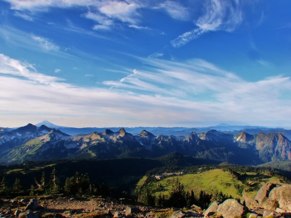 This is the view looking back to where I was had come from. The Paradise Inn and Ranger Station are about a mile back down from here. I had aspirations of being on the trail before the sun came up but I am very, very glad that I wasn't. It was about 50 as I set out and temps didn't change until I was on the descent of my hike, some 90+ minutes later. Not getting on the trail until the sun was rising turned out to be a blessing in disguise. I caught some elk grazing on the summer grass several times along the route.