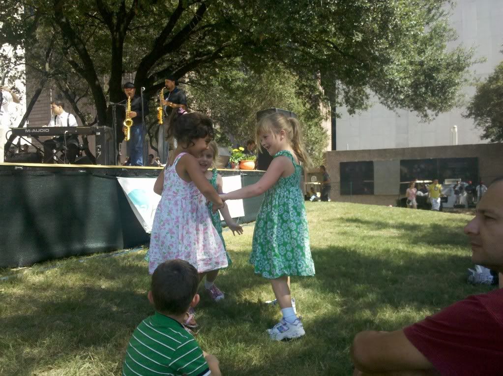 When we first got over there, a group doing traditional African dances was on stage. We were pretty far away from the act but Ellie and Campbell enjoyed the drumming a lot. When they finished a Latin jazz group was up next. We moved right up the stage and the girls started dancing with another little girl. By the time the band had finished their set about 10-12 little kids were trying their darndest to keep some kind of order. It was half dancing to the beat and half kiddo mosh pit.